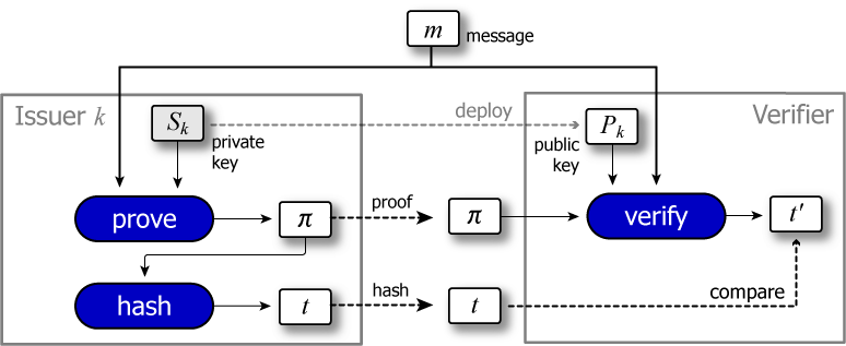 VRF には公開鍵 \(P_k\)、メッセージ \(m\) と証明 \(\pi\) からも \(t\) と同じハッシュ値を生成できるという特徴がある。つまり公開鍵 \(P_k\) を持っていれば、渡された証明 \(\pi\) やハッシュ値 \(t\) が本当に \(k\) によってメッセージ \(m\) に基づいて生成されたものかを検証することができる。\[ t' = {\rm verify}(P_k, m, \pi) \] もし \(\pi\) が \(S_k\) と \(m\) から生成されたものであれば \(t=t'\) となるし、そうでなければ \(t \ne t'\) や算出不能となる。