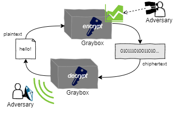 しかし、スマートカードや HSM (hardware security module) のように攻撃者がハードウェアを制御下に置いている状況では暗号化/復号化の処理時間や消費電力、発生する電磁波といったサイドチャネルの物理的な観測によってブラックボックス内の鍵の推測を試みることができる。このため昨今のクラウド環境のようにハードウェアを他人に委ねている状況では鍵情報を安全に保護できていると断言することは難しいという見方もある。このような脅威モデルに対する暗号をグレイボックス暗号 (gray-box cryptography) と呼ぶ (Fig 2)。