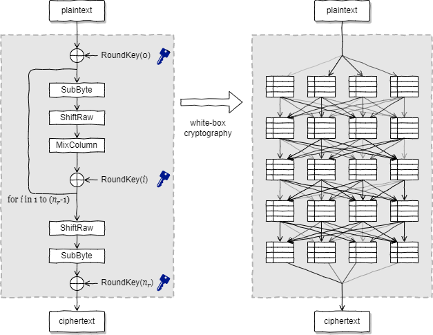 ホワイトボックス暗号は DES や AES といった一般的な対称鍵 (共有鍵) 暗号のブロックのラウンドの手順を難読化することによって行われる。これによって暗号化/復号化の機能に公開鍵暗号のような非対称性の特徴を与えている。公開鍵暗号と異なる点は、難読化した復号機構から鍵そのものを取り出すことが困難であるため、復号機構をハードウェア実装することで特定のハードウェアを持っているユーザのみが配信内容を復号化できるようなシステムを構築できる点である。