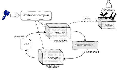 一般にホワイトボックス暗号は暗号化/復号化のような機能だけを提供して鍵情報そのものを含まず、機能を解読しても鍵を復元することが現実的に困難であるという不可逆性を持つ。