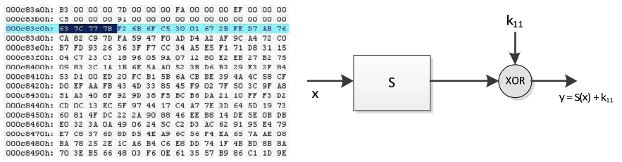 - S-box 演算とラウンドキーを含む演算が互いに隣接するように暗号を再編成し、例えば \(T_k(x) = S(x) + k\) のように S-box に秘密鍵をハードコーディングする。