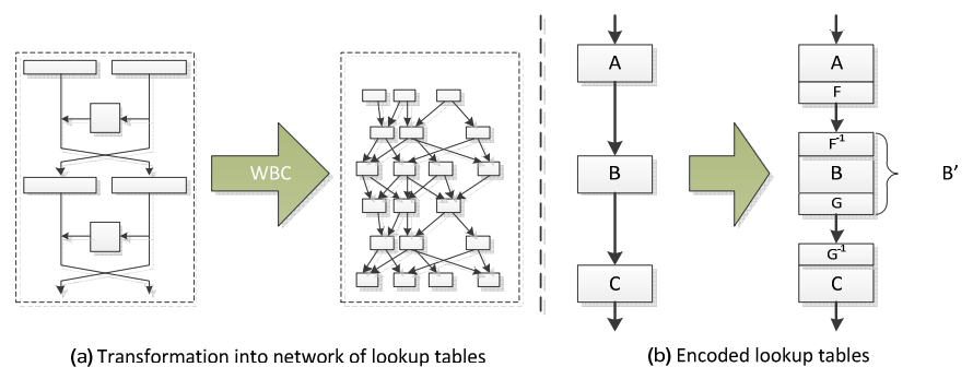 最初のホワイトボックス実装は 2002 年に Chow ら [Chow02DES, Chow02AES] によって DES と AES のそれぞれについて発表された。彼らのホワイトボックス技術は暗号を鍵に依存する一連のルックアップテーブルに変換する (Figure 2 (a) 参照)。秘密鍵はルックアップテーブルにハードコードされており、ランダム化技法を適用することで保護されている。この方法では、ランダム対消滅エンコーディングをルックアップテーブルに挿入してルックアップテーブルとその間のデータフローをランダム化することで実装全体のセマンティクス機能を維持している。これは Figure 2 (b) に示されており、F と G はそれぞれ A, B と B, C 間に挿入されるランダムエンコーディングである。全体的な機能 (入力 A - 出力 C) は変わらない。