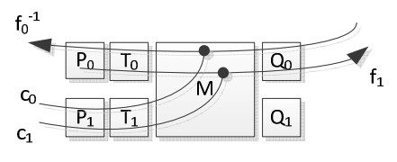 - 基礎となる AES 実装の 1 つの (エンコードされた) ラウンドを表すルックアップテーブルのセットを分離する。展開される変換は (秘密鍵と導入されたランダム性まで) 既知であるためこれは簡単である。Figure 3 はこのようなラウンドの構成を示しており、P と Q は内部エンコーディング、Ti はハードコードされた鍵を持つ S-box、M は暗号の線形部分 (MixColumns 演算など) を表している。