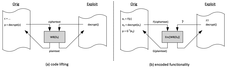 同様の論理的アプローチはホワイトボックス暗号についても [Sax09] で考案されている。コード難読化とホワイトボックス暗号の主な違いは、後者はセキュリティ概念に基づいてセキュリティを検証する必要があるということである。セキュリティ概念とは暗号化スキームのセキュリティを形式的に記述したものである。例えば、攻撃者が特定の暗号文から平文を算出できない場合は CPA セキュア、秘密鍵を復元できない場合は KR セキュアというスキームが定義されている。