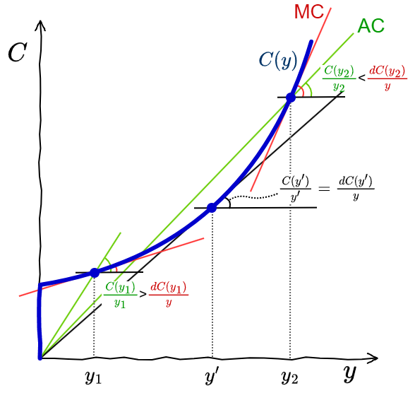 標準的なケースでは費用関数 \(C(y)\) は下に凸の形をしていることから、平均費用は一度下がり、費用関数が原点との直線で接する点 \(y'\) で最小値を取り、それ以降は上昇する。つまり平均費用は生産 \(y\) に対して U 字型の曲線を描く。