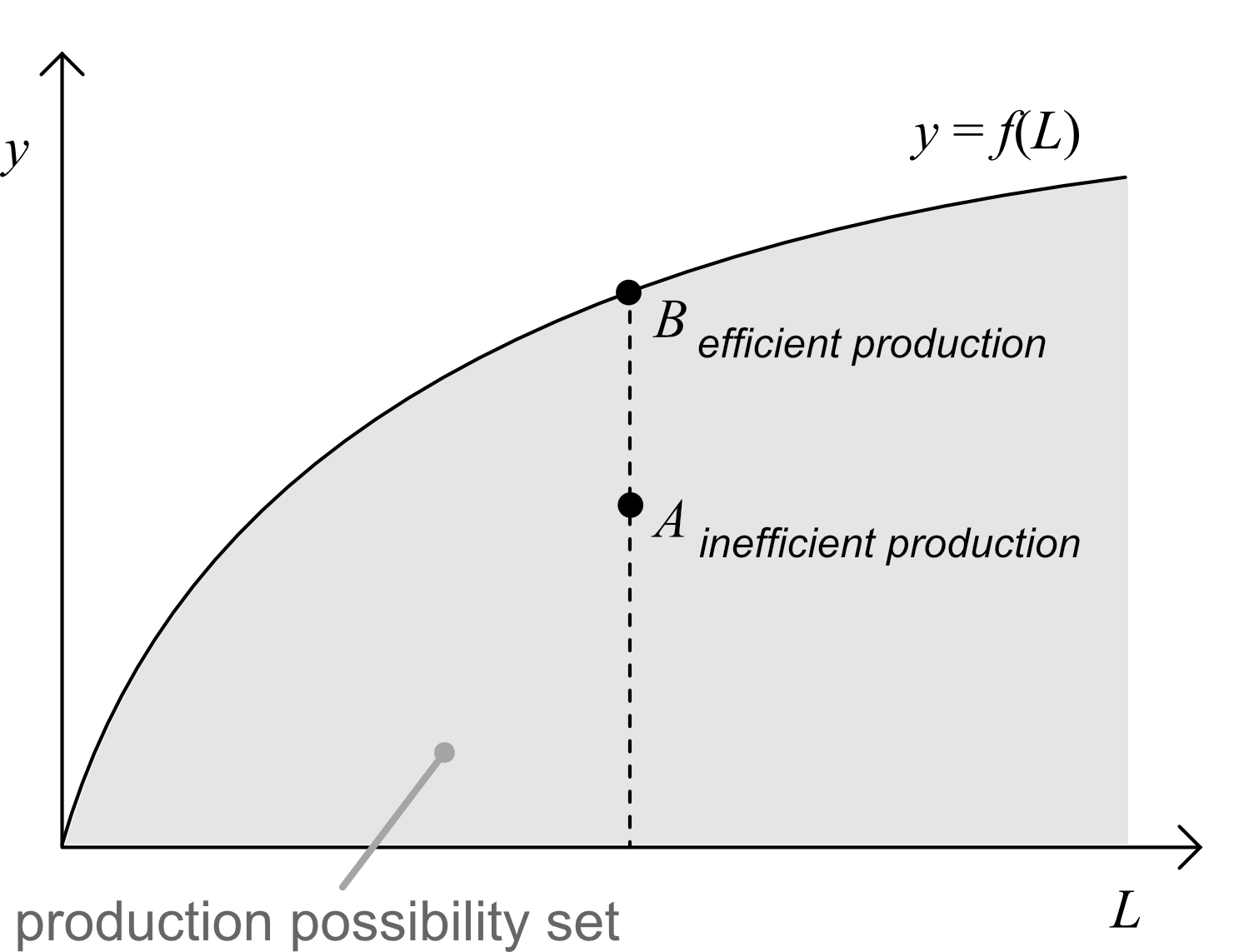 Fig 1 でグレーで表されている領域が生産可能性集合で、その縁となる曲線が生産関数を表している。ここで生産 \(A\) は投入に対して生産を上げる余地があり非効率的である。生産 \(B\) は投入に対して達成可能な上限にあり効率的と言える。