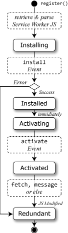 navigator.serviceWorker.register()が実行されると Service Worker の JavaScript ファイルがダウンロードされ Installing 状態となる。Service Worker のinstallイベントが正常終了すれば状態は Installed となるが、いずれかのステップでエラーが発生した場合は Redundant となりそれ以降に参照されることはない。 - Installed/Activating/Waiting
